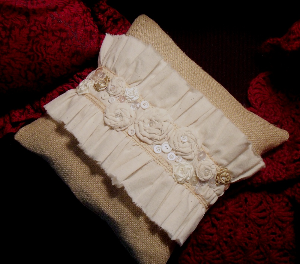 So I hot glued the rosettes, large and small, added buttons (including some YUMMY turquoise sea shell buttons, just gorgeous) and beads and whatever the heck looked good and had fun. It took less than an hour and I really had to stop before I went too far from "sweet pillow" into "Las Vegas showgirl," you know how that happens. ;0) Oooh, I like it alot! Here she is on my brown couch with her cousins, the bedroom pillows.Now, I would NEVER, EVER hot glue rosettes or anything else on my projects I sell in my Etsy shop. I hand sew every bit of trim and beading and ribbon to my pillows and necklaces. With hot glue it is too easy for restless fingers to seek out a weak bond and just pull stuff off (I'm looking at you, terrible toddlers and mischievous teens!) But this was a quick and easy, totally spur of the moment project. It was too much fun, too.